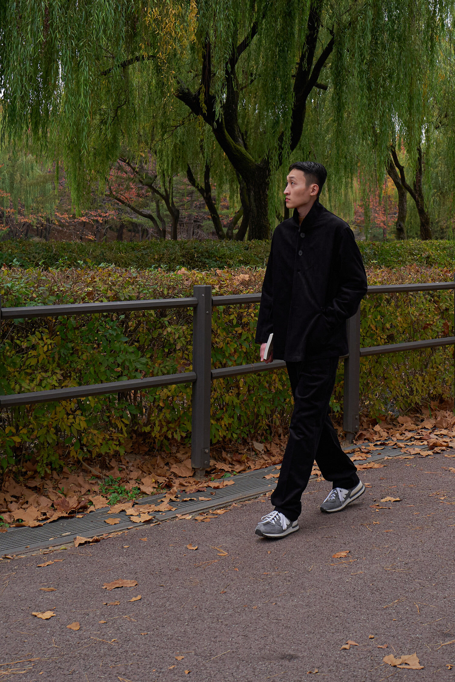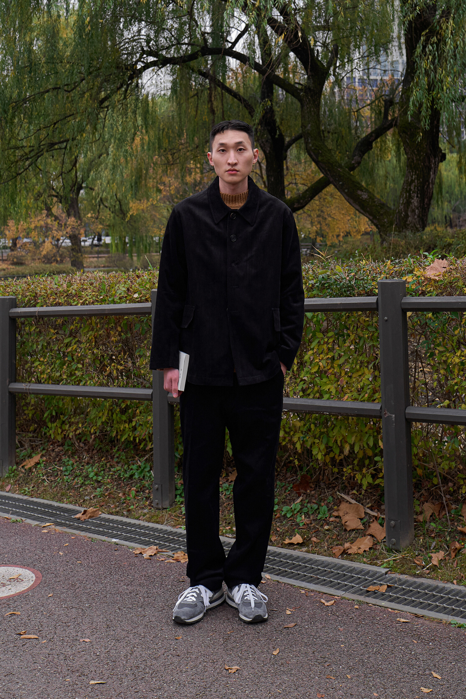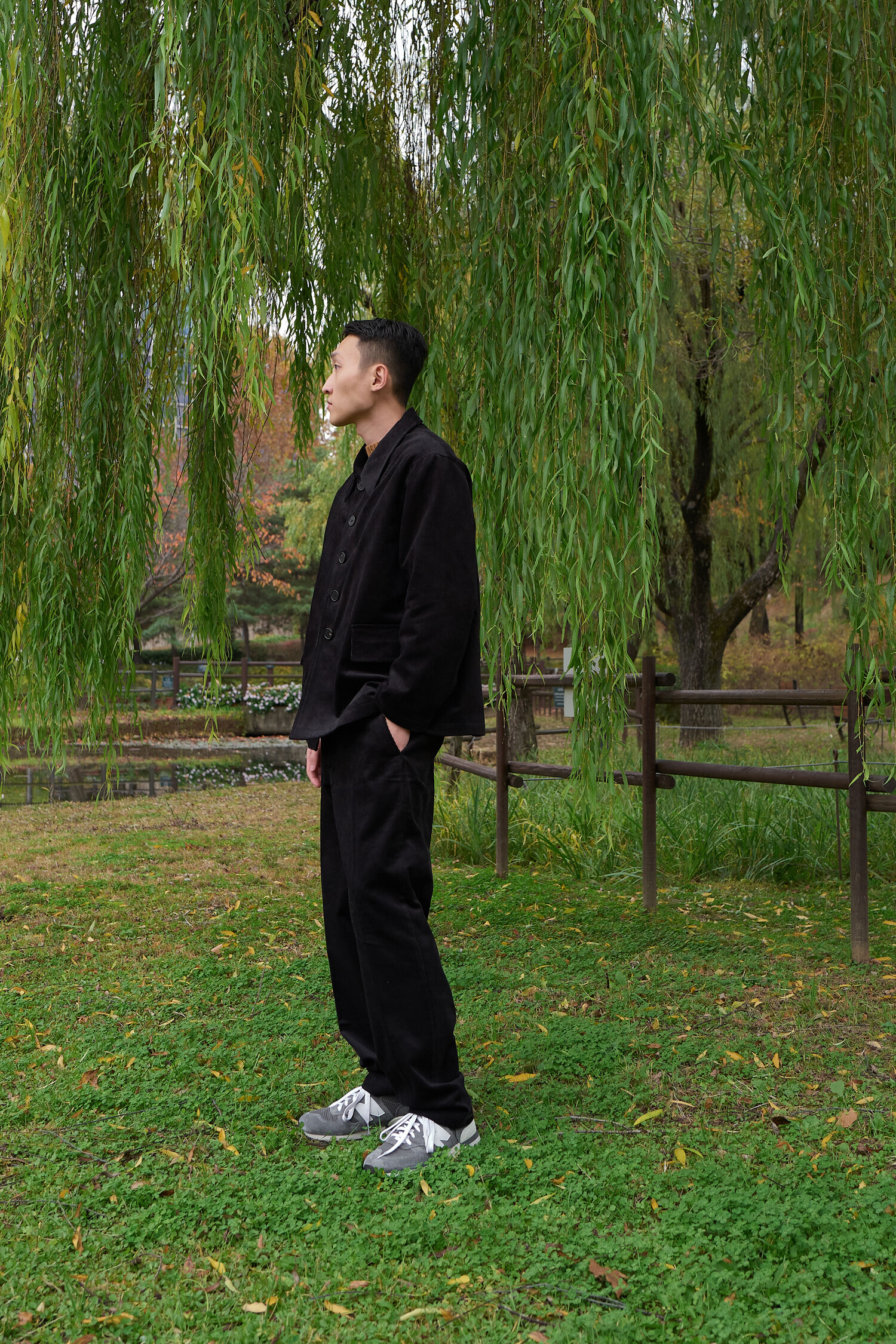 허벅지는 와이드하게 여유롭고 아래로 내려올수록 좁아지는 실루엣의 팬츠입니다. 과하지 않은 볼륨감이 흐르는 제품입니다. 다소 긴 기장감의 제품을 그대로 신발 위로 떨어트려 주름을 만들어 자연스럽게 착용하는 것을 의도하고 제작되었습니다.