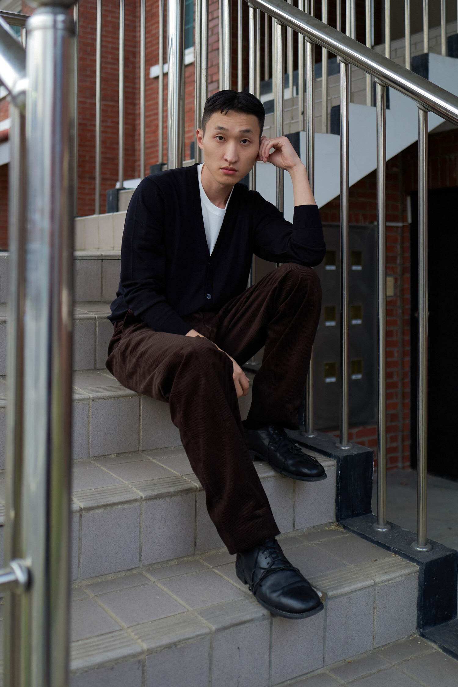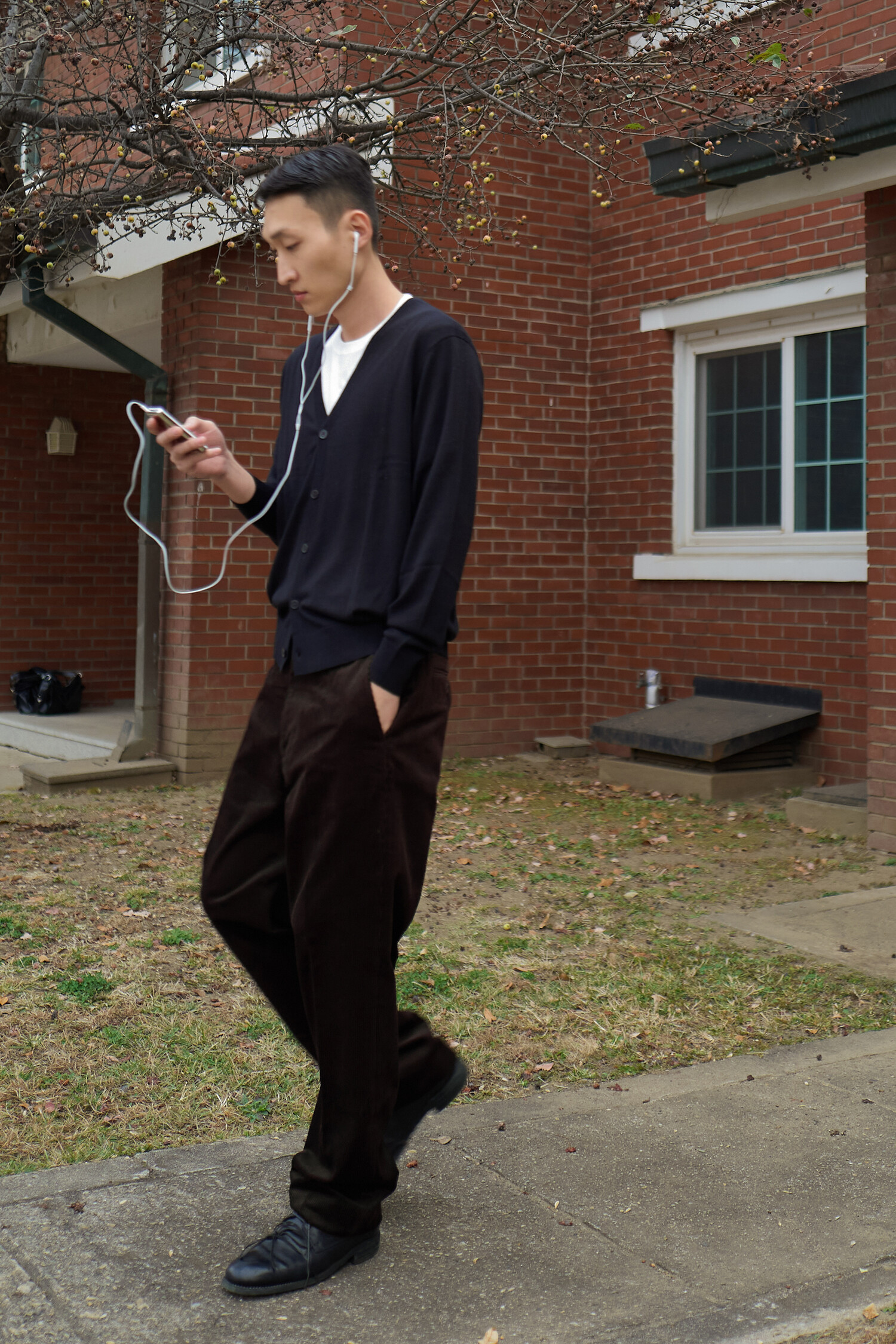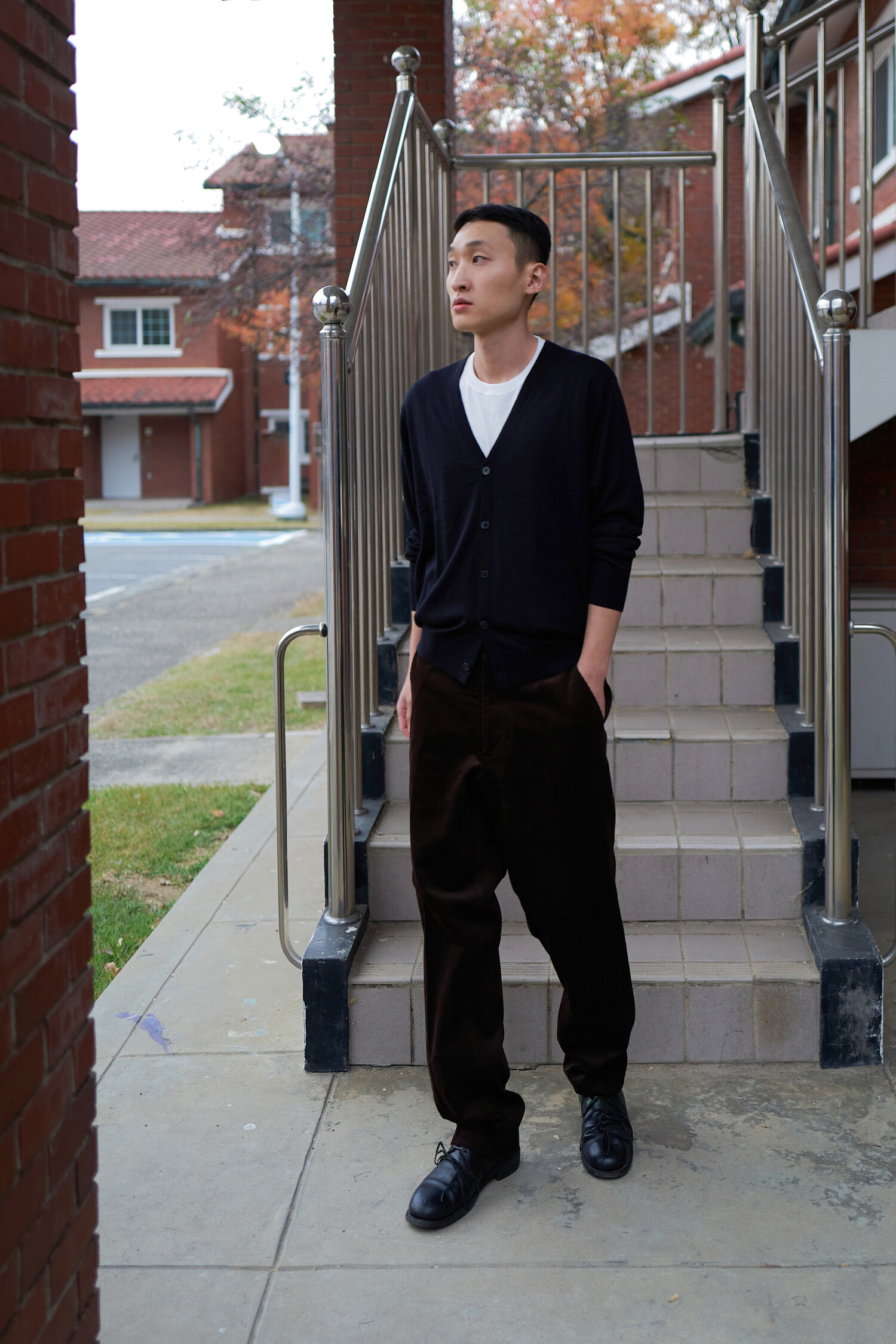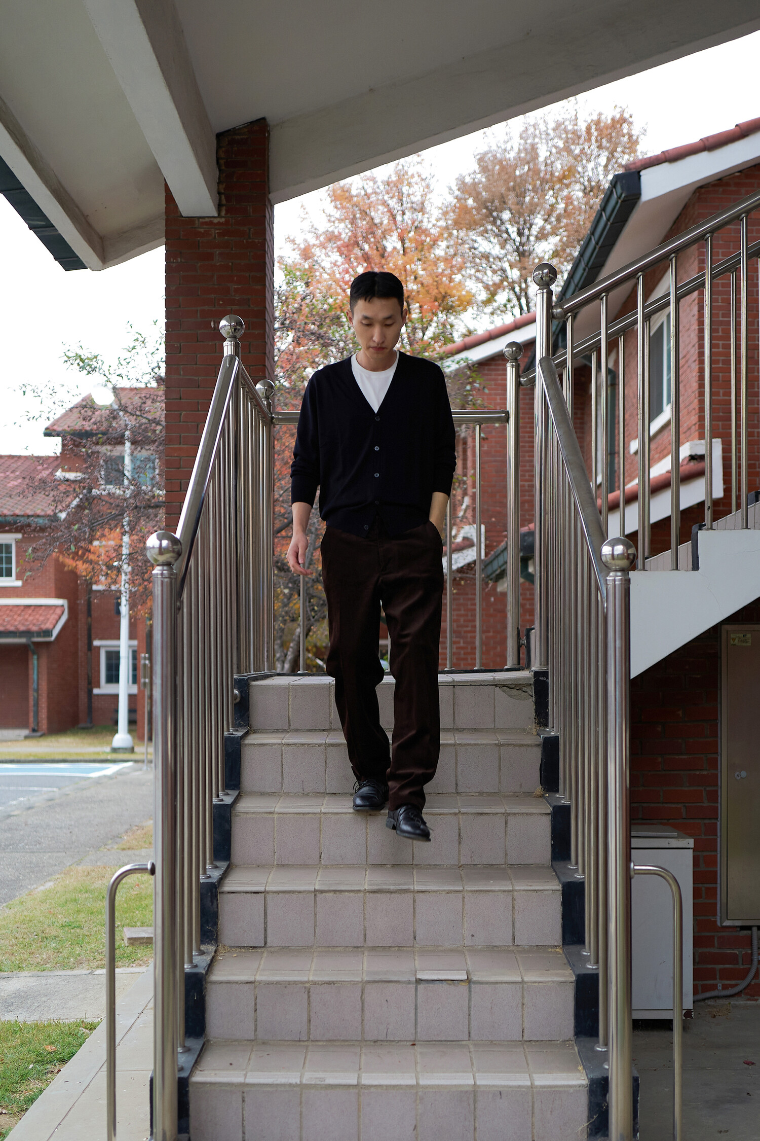 허벅지는 와이드하게 여유롭고 아래로 내려올수록 좁아지는 실루엣의 팬츠입니다. 과하지 않은 볼륨감이 흐르는 제품입니다. 다소 긴 기장감의 제품을 그대로 신발 위로 떨어트려 주름을 만들어 자연스럽게 착용하는 것을 의도하고 제작되었습니다.