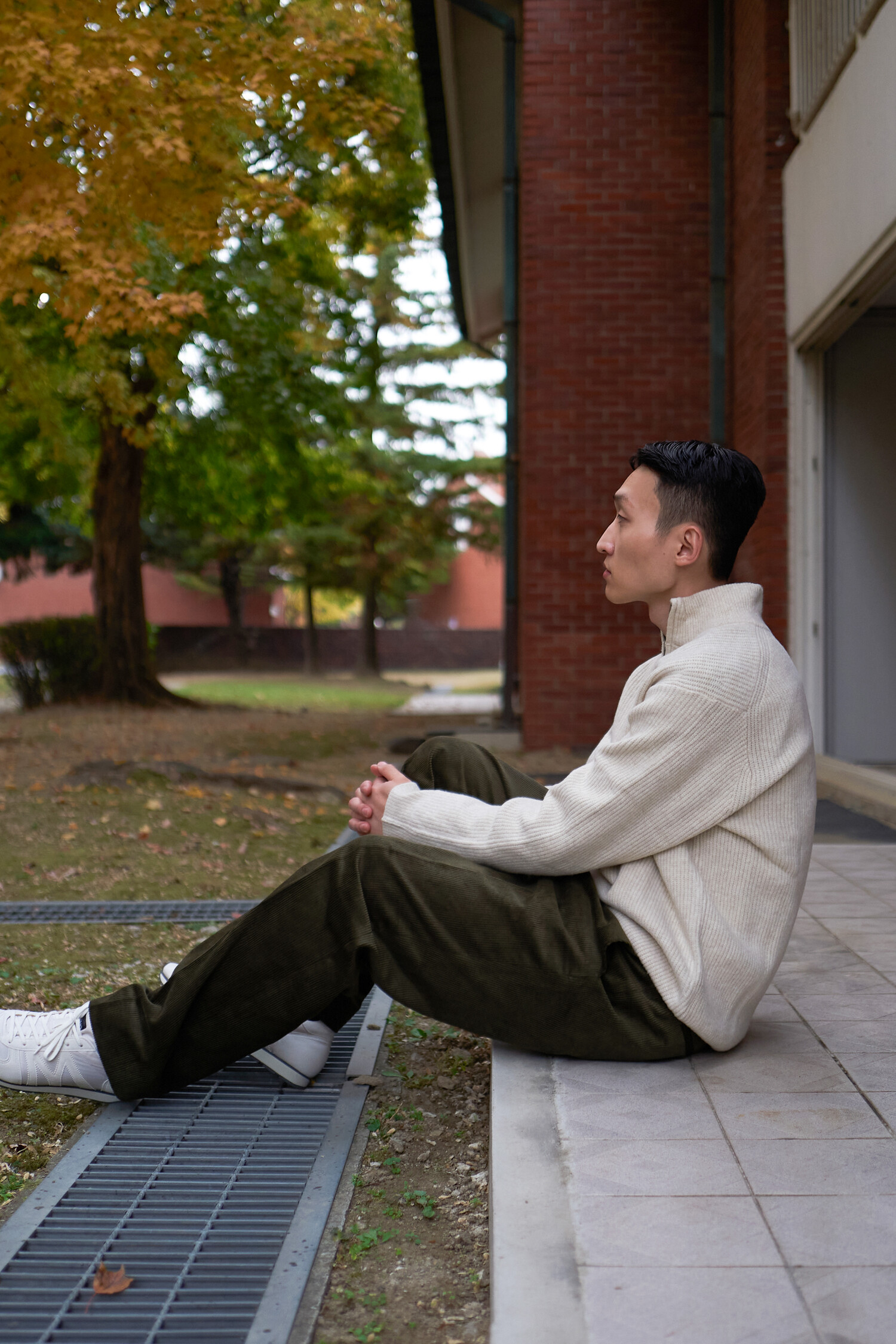 허벅지는 와이드하게 여유롭고 아래로 내려올수록 좁아지는 실루엣의 팬츠입니다. 과하지 않은 볼륨감이 흐르는 제품입니다. 다소 긴 기장감의 제품을 그대로 신발 위로 떨어트려 주름을 만들어 자연스럽게 착용하는 것을 의도하고 제작되었습니다.