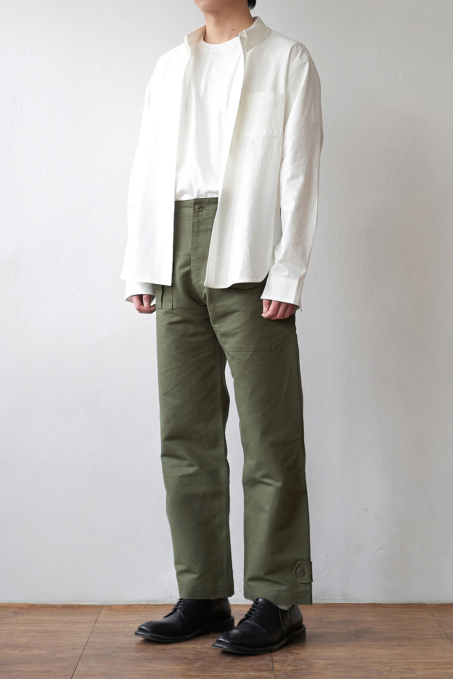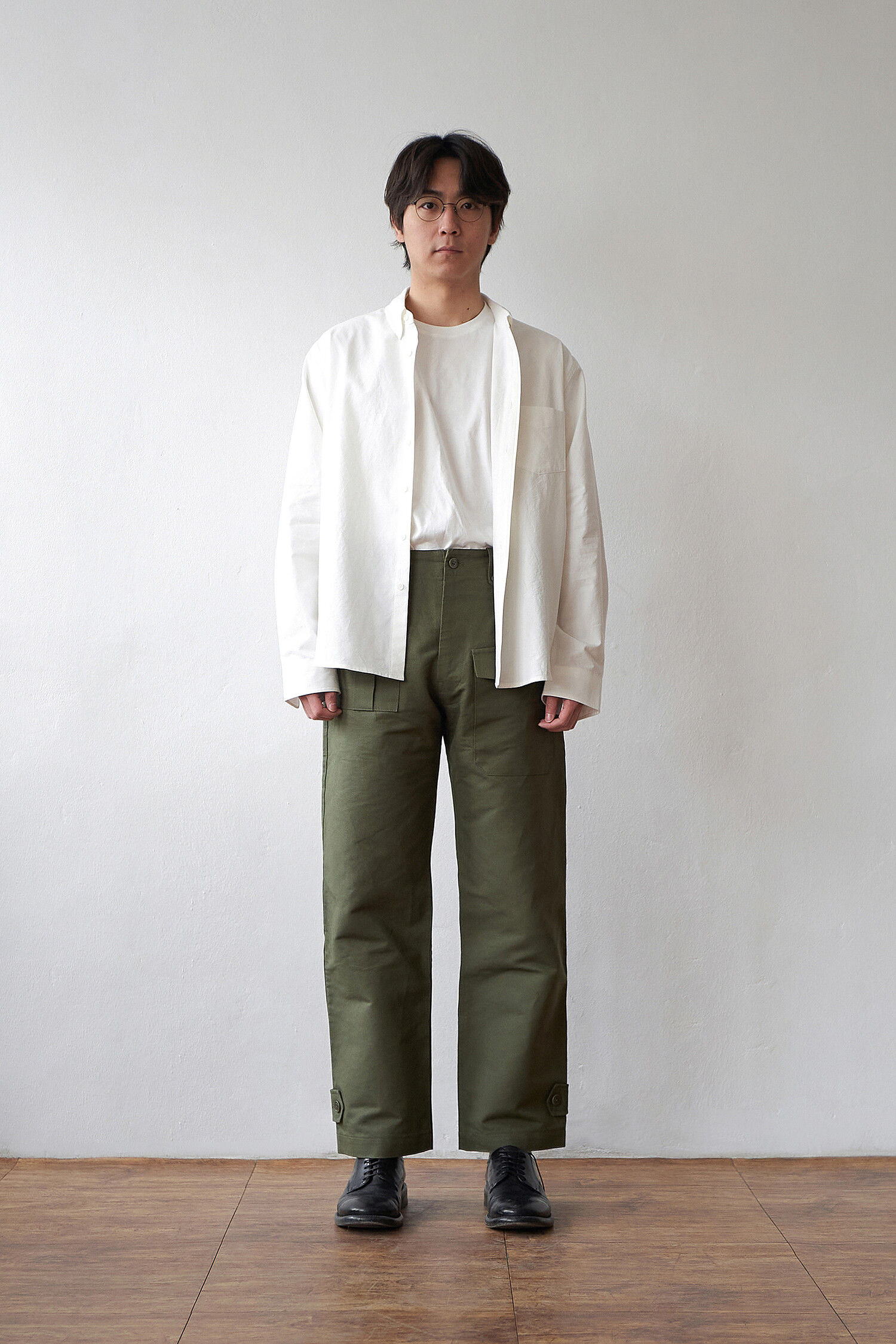 프렌치 밀리터리 M44 팬츠를 모티브로 디자인된 제품입니다. 허벅지 부근에 자리잡은 두 개의 주머니와 단추로 마무리되는 벨트/밑단의 고리가 디테일이며 뒷 주머니 역시도 다트 선들을 의도적으로 드러내 매력을 더했습니다. 스트레이트 핏 실루엣으로 발목까지 떨어지는 기장감으로 입으시는 걸 추천드리며, 그에 맞게 더패브릭의 다른 제품들에 비해 기장은 조금 타이트하게 출시되었습니다.