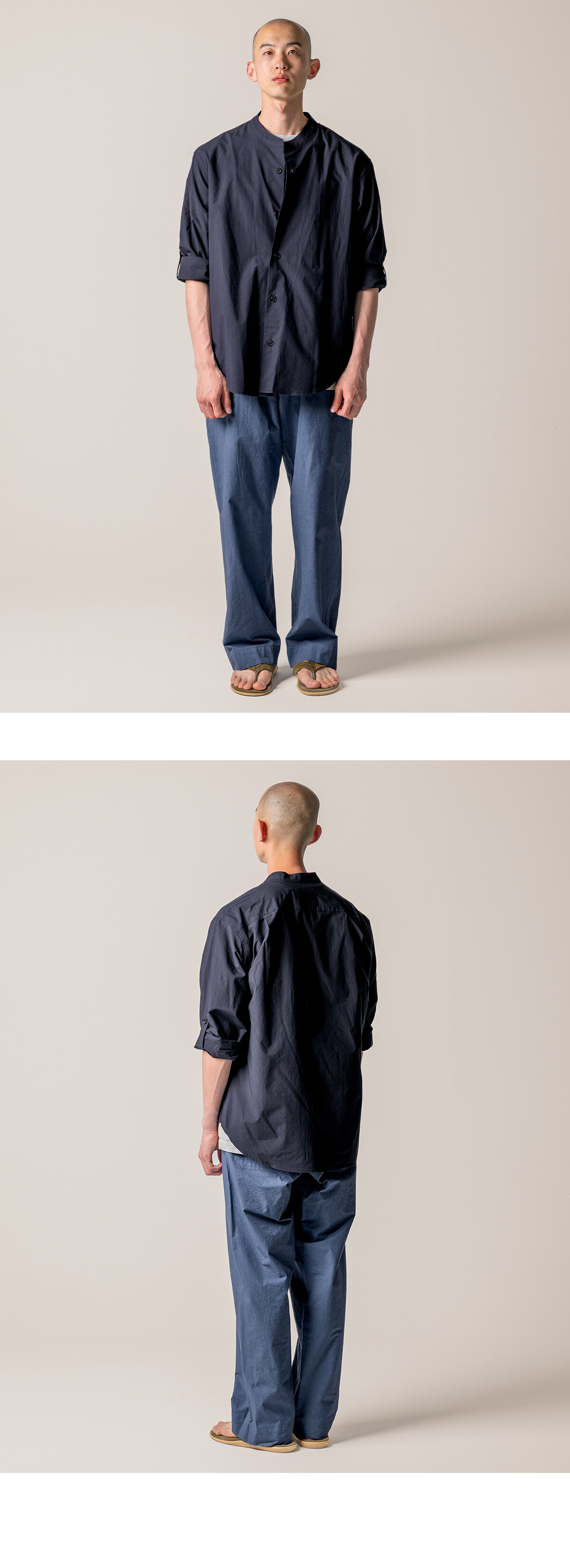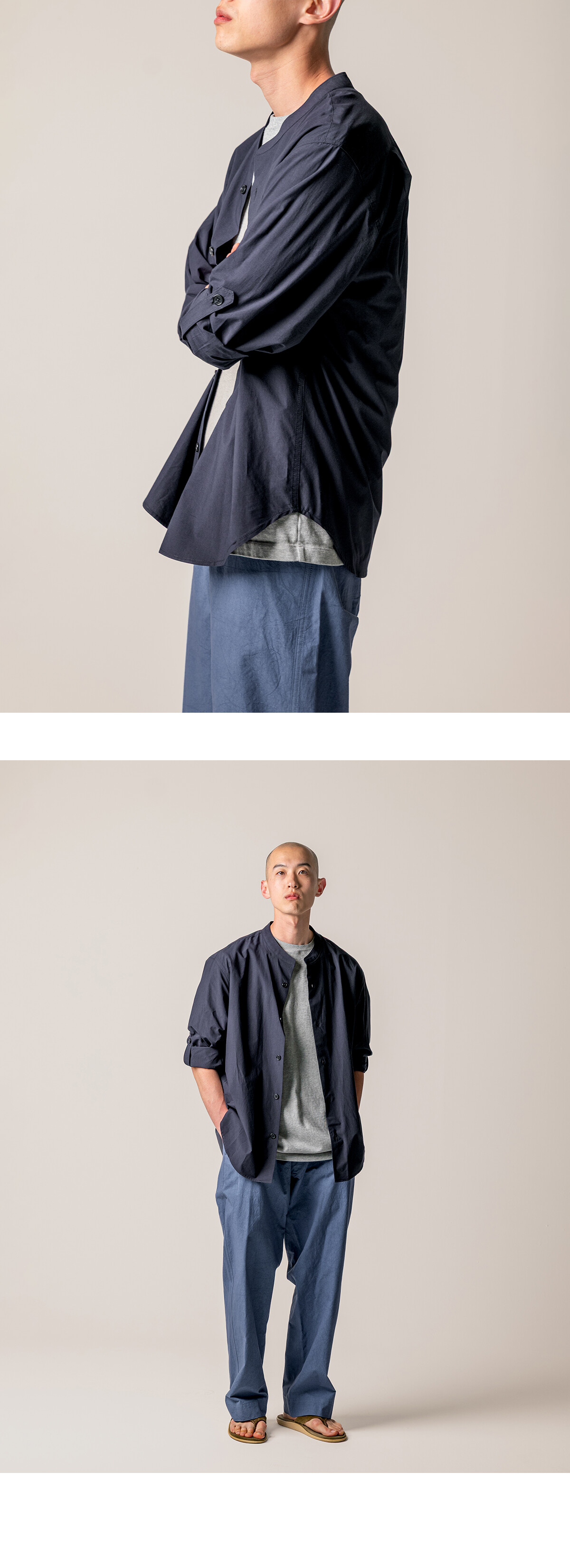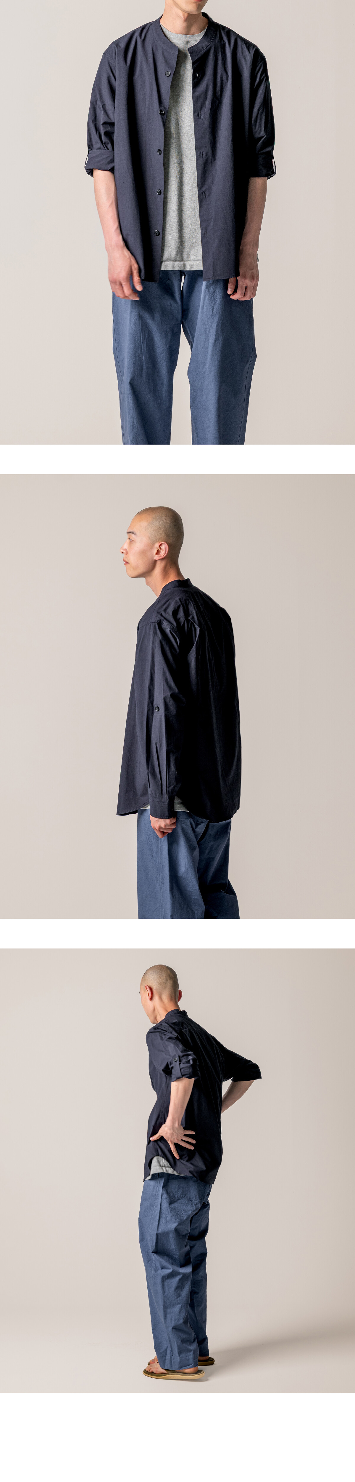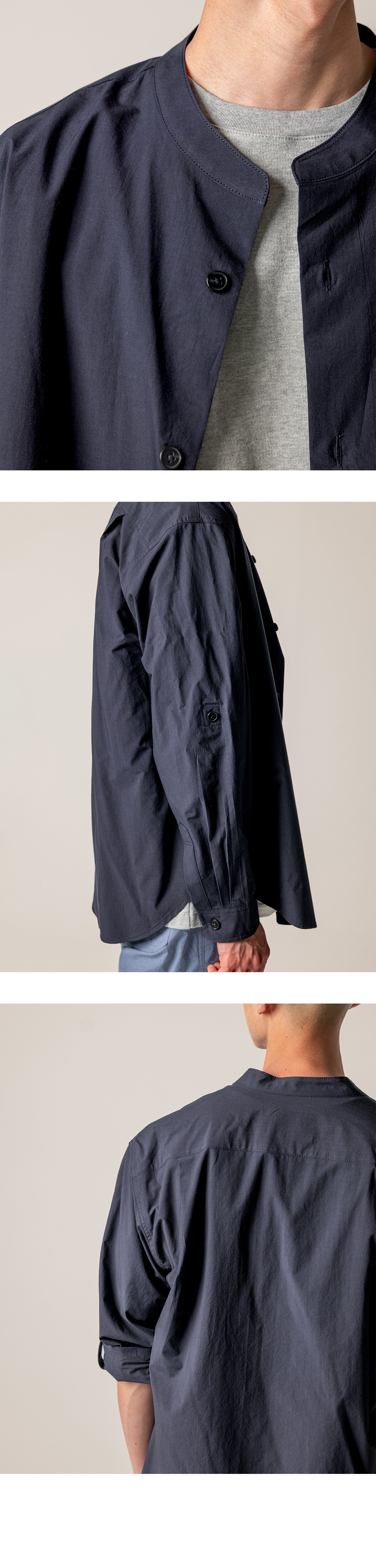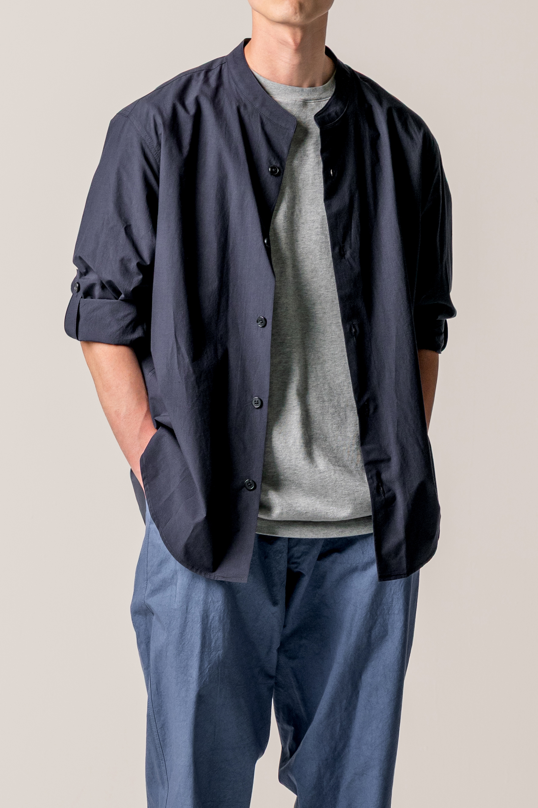 더울 때는 소매를 걷어 가볍게, 쌀쌀한 날씨에는 그대로 내려 입을 수 있습니다. 하나의 셔츠로 자연스럽게 조절할 수 있습니다. 카라는 차이나 형태를 적용했습니다. 기장은 여유 있게 가져가, 여유롭게 하여 반팔 셔츠 특유의 단정한 느낌을 덜어내도록 했습니다.