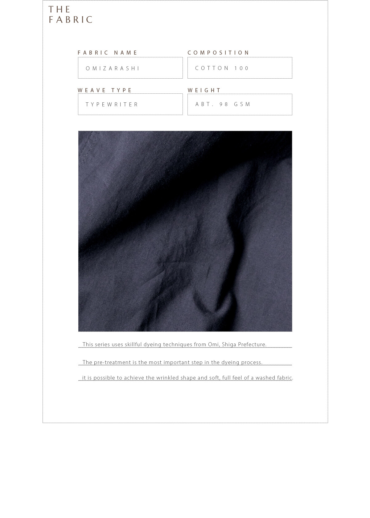 원단은 더패브릭의 시그니처인 일본의 오미자라시 소재를 사용했습니다. 한여름에도 입을 수 있는 80수의 얇은 두께임에도 불구하고 일반적인 얇은 원단과는 다른, 직조감과 터치감이 특징입니다.