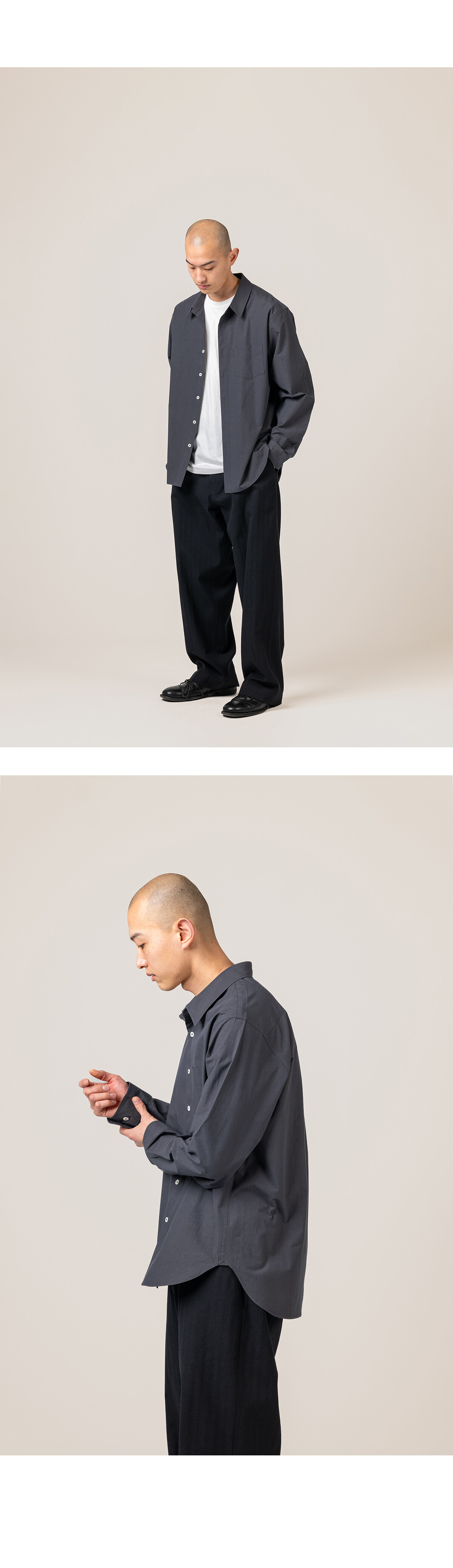 불필요한 장식을 덜어내고 셔츠의 구조는 최대한 단순하게 유지했습니다. 대신 셔츠가 가진 단정함이 너무 앞서지 않도록, 300년 이상의 역사를 가진 일본 전통 기법인 ‘오미즈라시’를 활용해 일상의 리듬에 가까운 질감을 더하는 데 집중했습니다. 형태는 차분하게, 인상은 조금 느슨하게 가져가는 제품입니다.