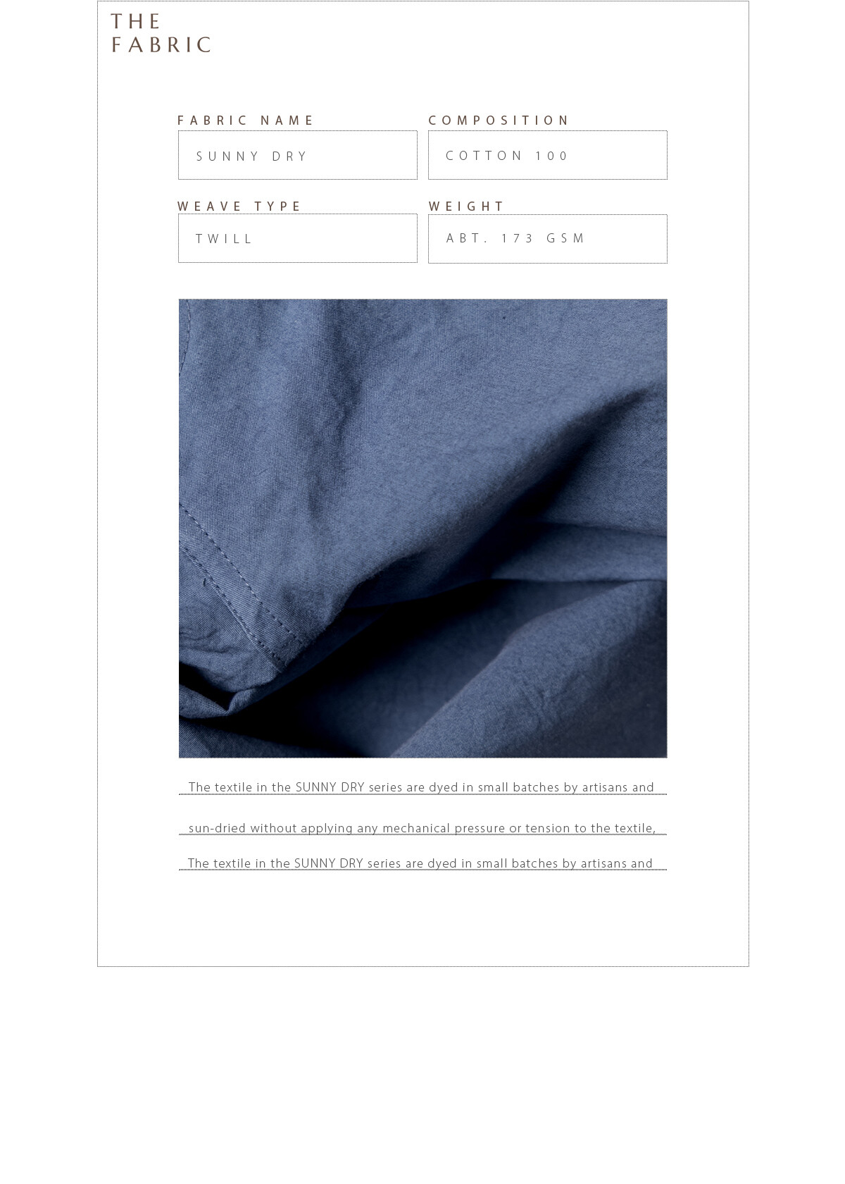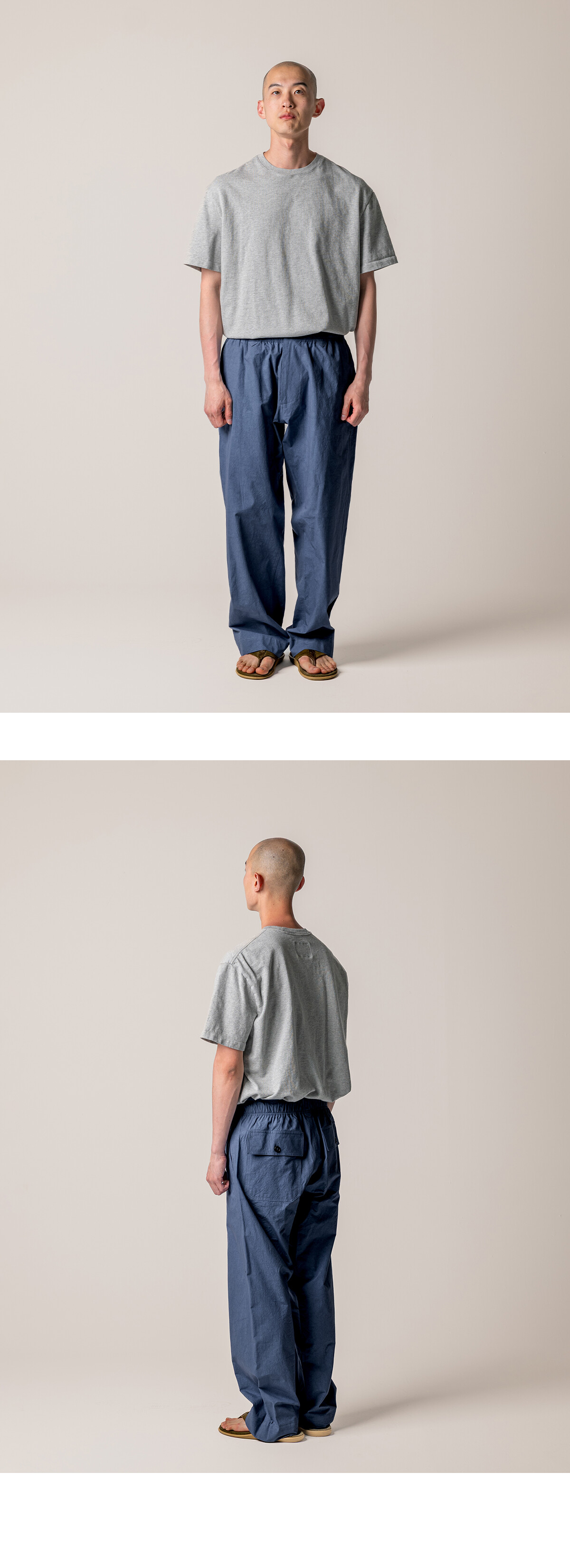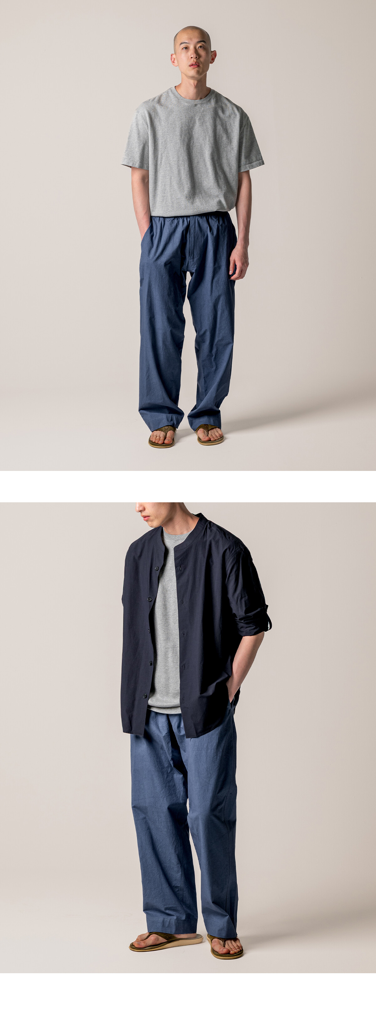 허리는 전체 밴딩 구조로 설계했습니다. 편안하게 착용할 수 있도록 스트링을 더하고, 벨트 루프도 함께 적용했습니다. 실루엣은 와이드 스트레이트로 정리했습니다. 허벅지는 여유 있게 두고, 밑단은 좁히지 않고 곧게 떨어지도록 설계했습니다. 발등 위로 자연스럽게 내려오는 기장으로 과하지 않은 균형을 맞췄습니다. 사용된 서니 드라이 원단은 기계적 압력을 최소화하고 햇볕 아래에서 천천히 건조해 완성됩니다. 표면에 남는 미세한 결이 팬츠의 단정한 실루엣에 자연스러운 여유를 더합니다. 단독으로도 충분하지만, 같은 원단의 Zip Blouson과 함께 착용하면 더 균형 잡힌 셋업이 완성됩니다. 편안함과 정돈 사이, 그 중간을 기준으로 둔 이지팬츠입니다.