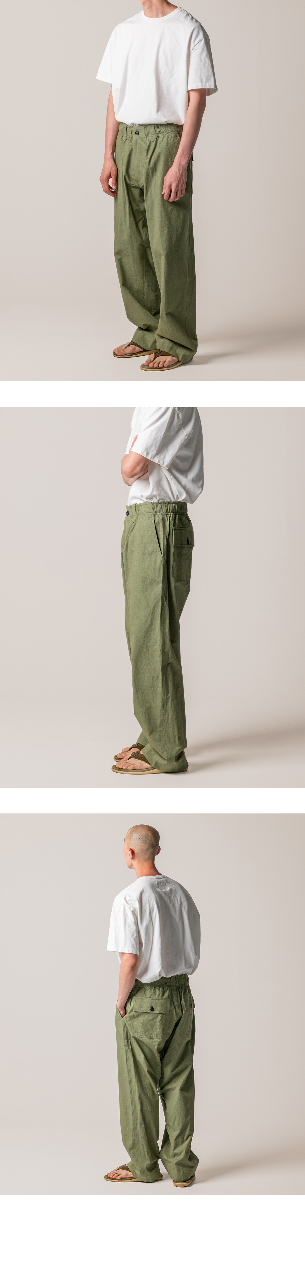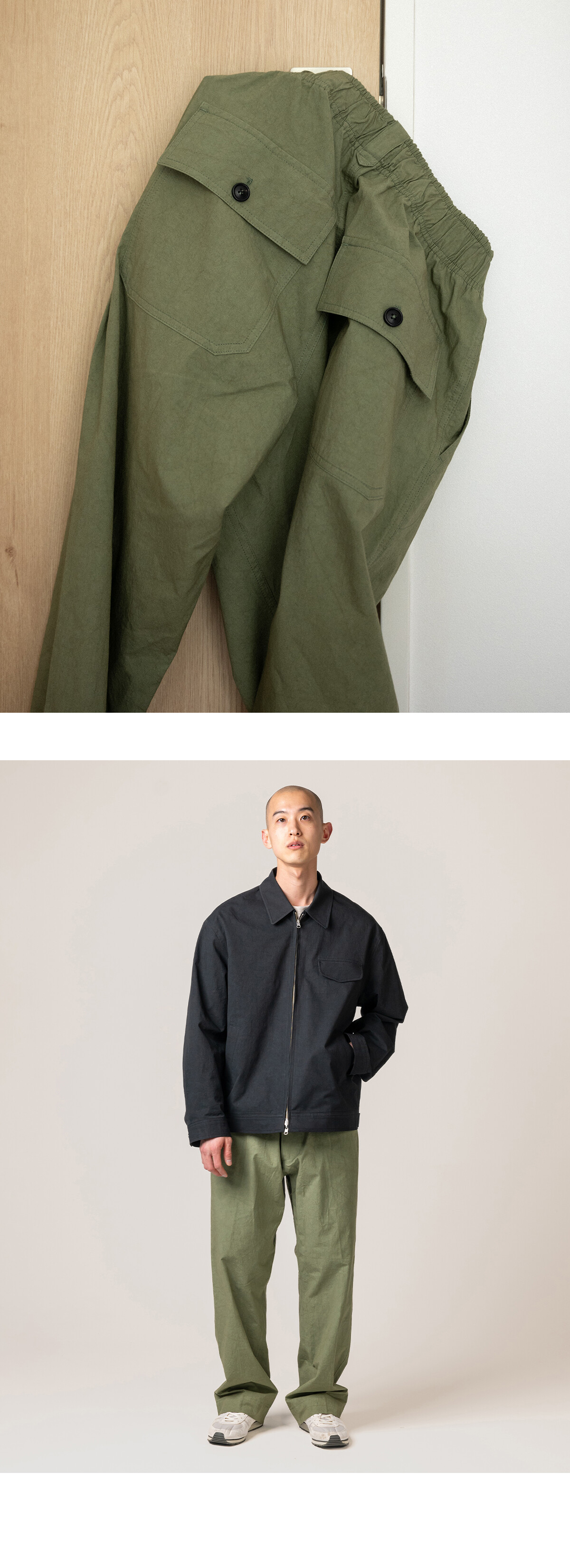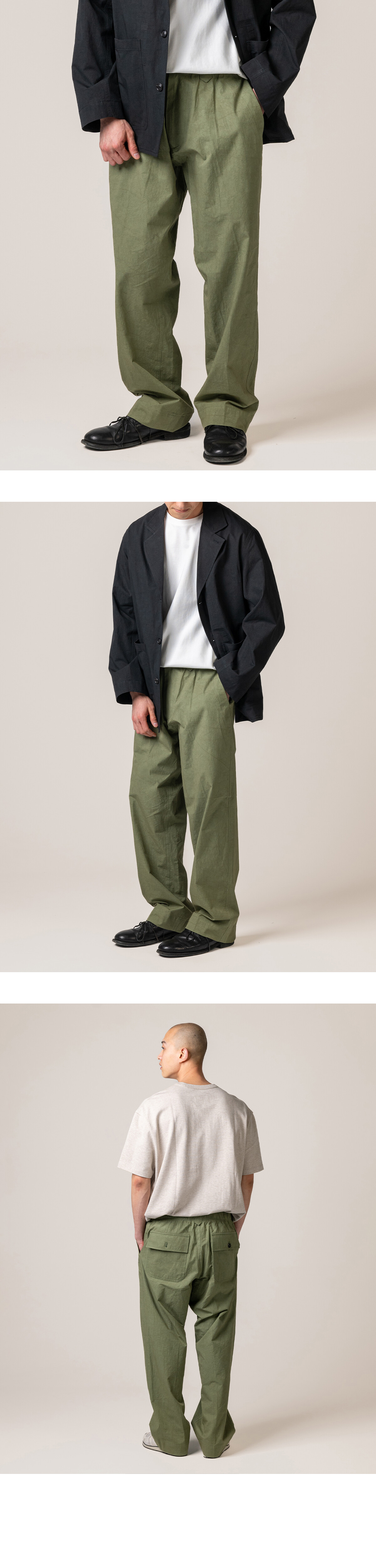 허리는 전체 밴딩 구조로 설계했습니다. 편안하게 착용할 수 있도록 스트링을 더하고, 벨트 루프도 함께 적용했습니다. 실루엣은 와이드 스트레이트로 정리했습니다. 허벅지는 여유 있게 두고, 밑단은 좁히지 않고 곧게 떨어지도록 설계했습니다. 발등 위로 자연스럽게 내려오는 기장으로 과하지 않은 균형을 맞췄습니다. 사용된 서니 드라이 원단은 기계적 압력을 최소화하고 햇볕 아래에서 천천히 건조해 완성됩니다. 표면에 남는 미세한 결이 팬츠의 단정한 실루엣에 자연스러운 여유를 더합니다. 단독으로도 충분하지만, 같은 원단의 Zip Blouson과 함께 착용하면 더 균형 잡힌 셋업이 완성됩니다. 편안함과 정돈 사이, 그 중간을 기준으로 둔 이지팬츠입니다.
