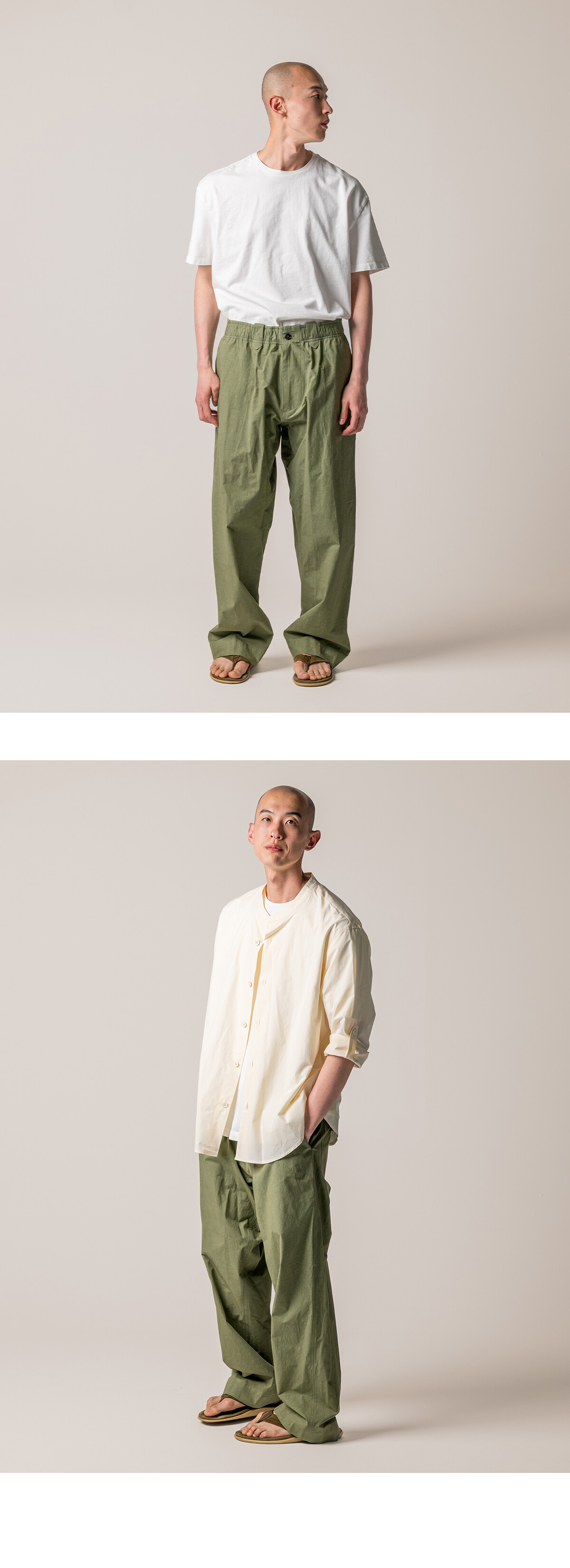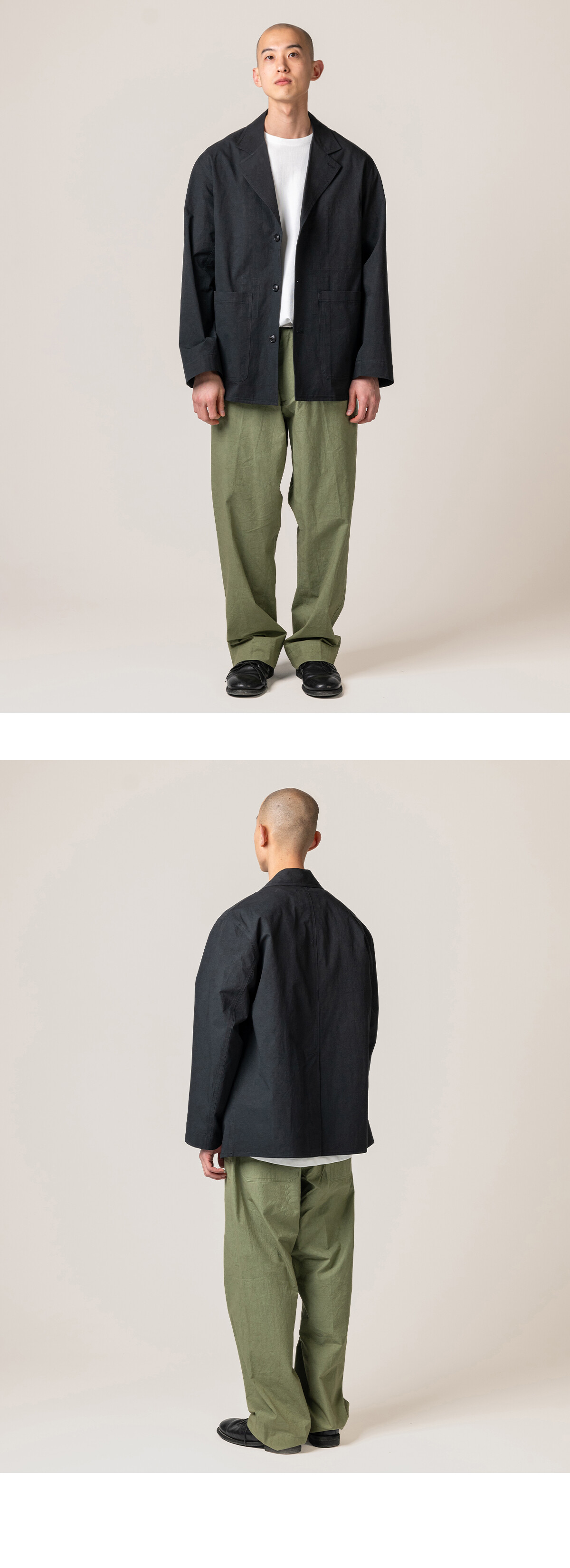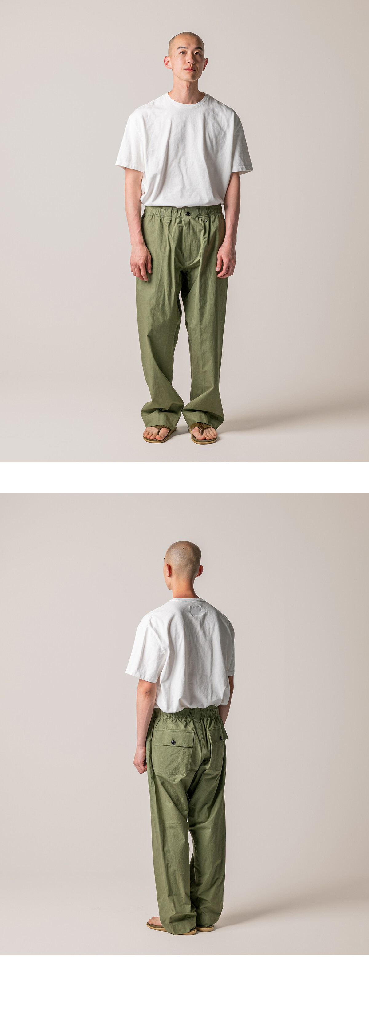허리는 전체 밴딩 구조로 설계했습니다. 편안하게 착용할 수 있도록 스트링을 더하고, 벨트 루프도 함께 적용했습니다. 실루엣은 와이드 스트레이트로 정리했습니다. 허벅지는 여유 있게 두고, 밑단은 좁히지 않고 곧게 떨어지도록 설계했습니다. 발등 위로 자연스럽게 내려오는 기장으로 과하지 않은 균형을 맞췄습니다. 사용된 서니 드라이 원단은 기계적 압력을 최소화하고 햇볕 아래에서 천천히 건조해 완성됩니다. 표면에 남는 미세한 결이 팬츠의 단정한 실루엣에 자연스러운 여유를 더합니다. 단독으로도 충분하지만, 같은 원단의 Zip Blouson과 함께 착용하면 더 균형 잡힌 셋업이 완성됩니다. 편안함과 정돈 사이, 그 중간을 기준으로 둔 이지팬츠입니다.