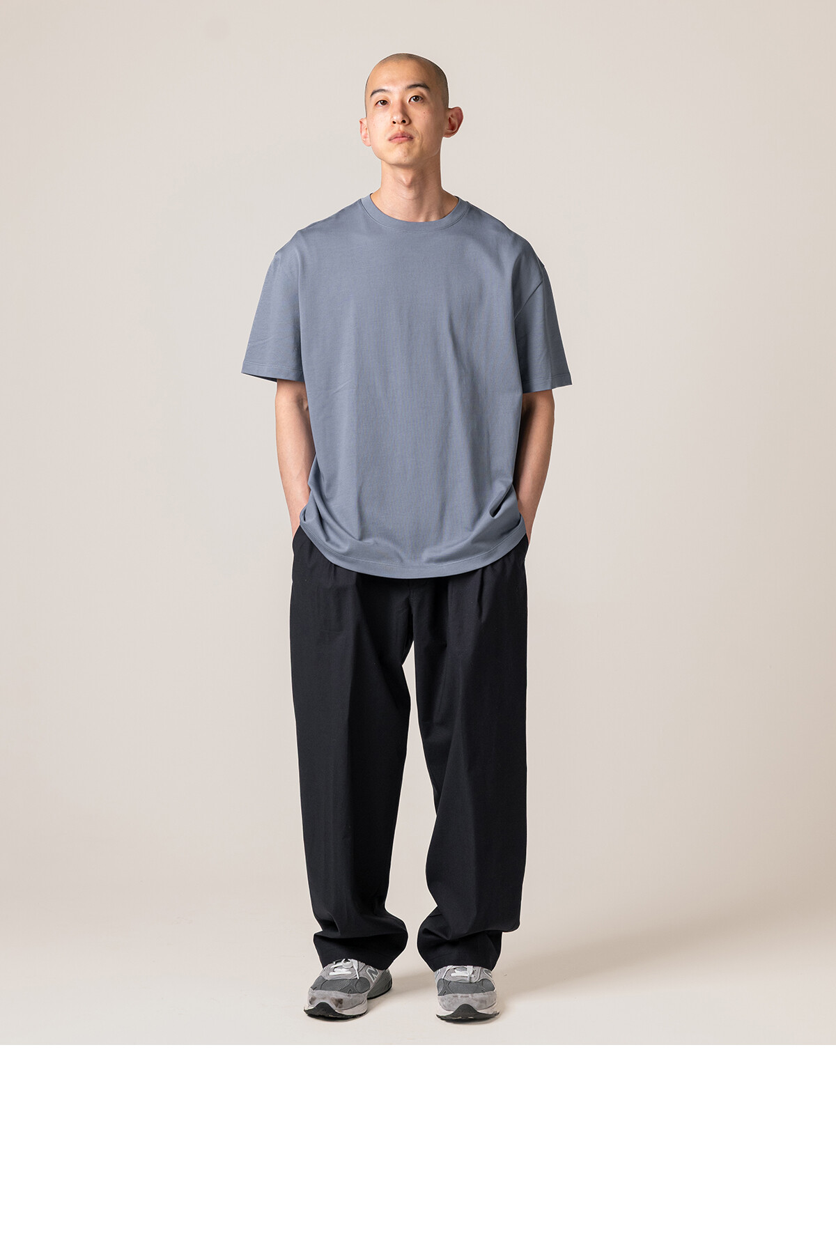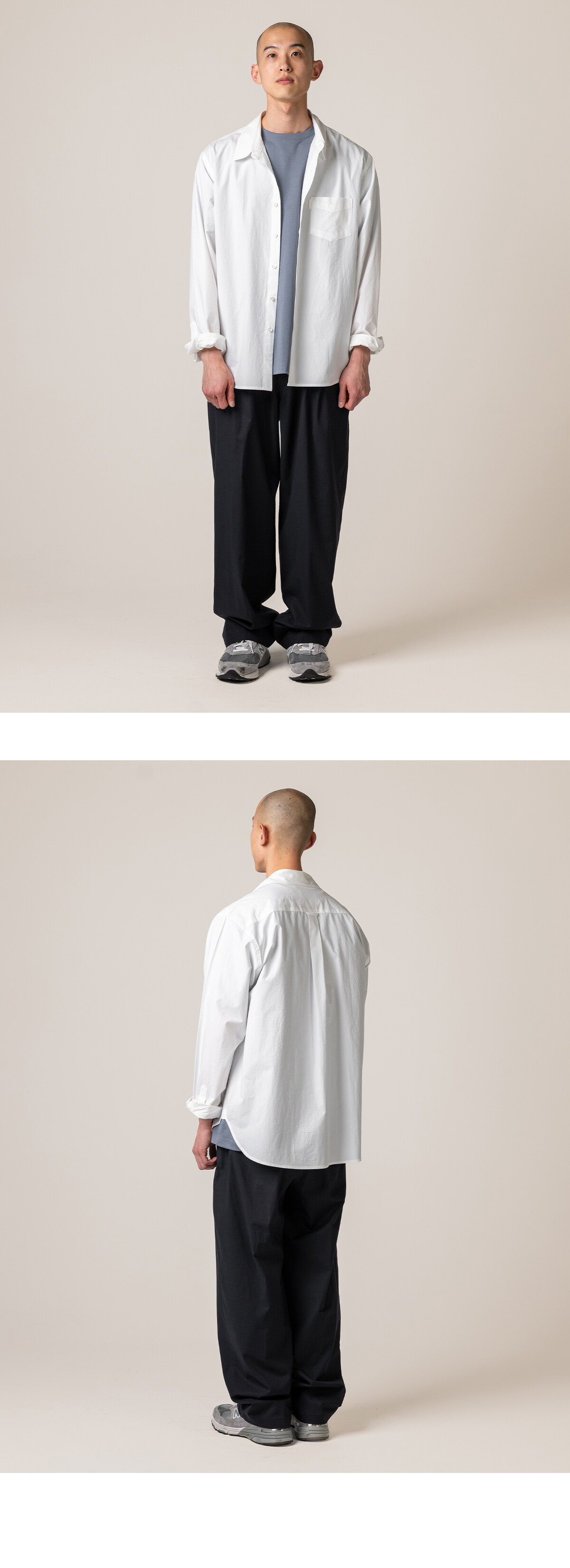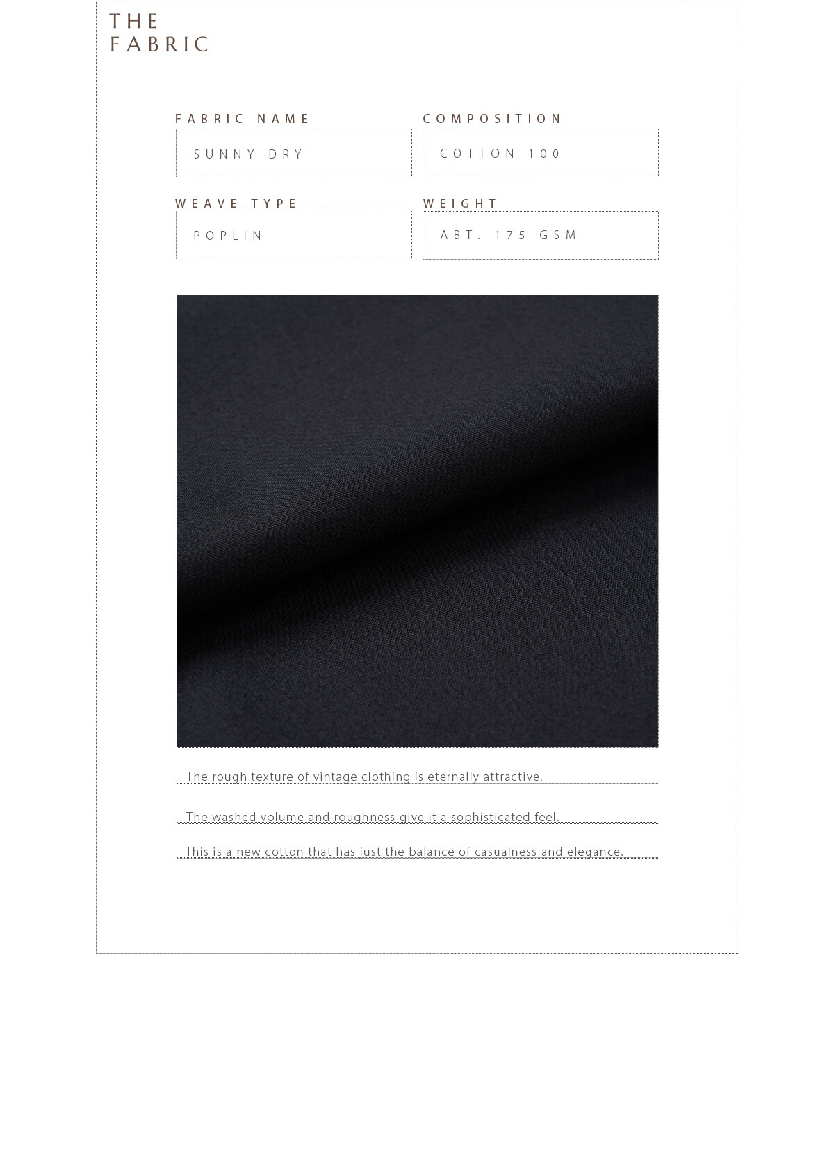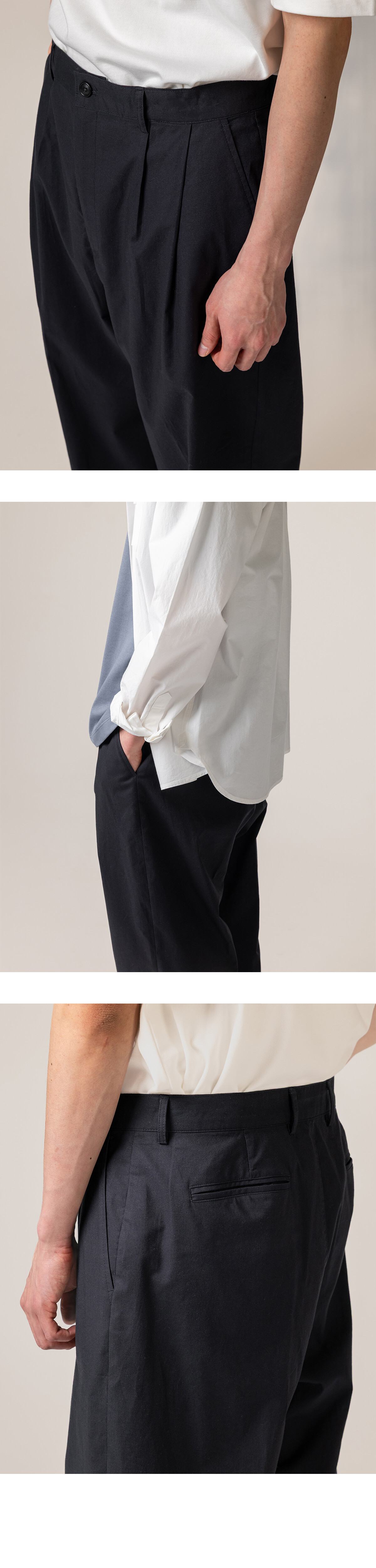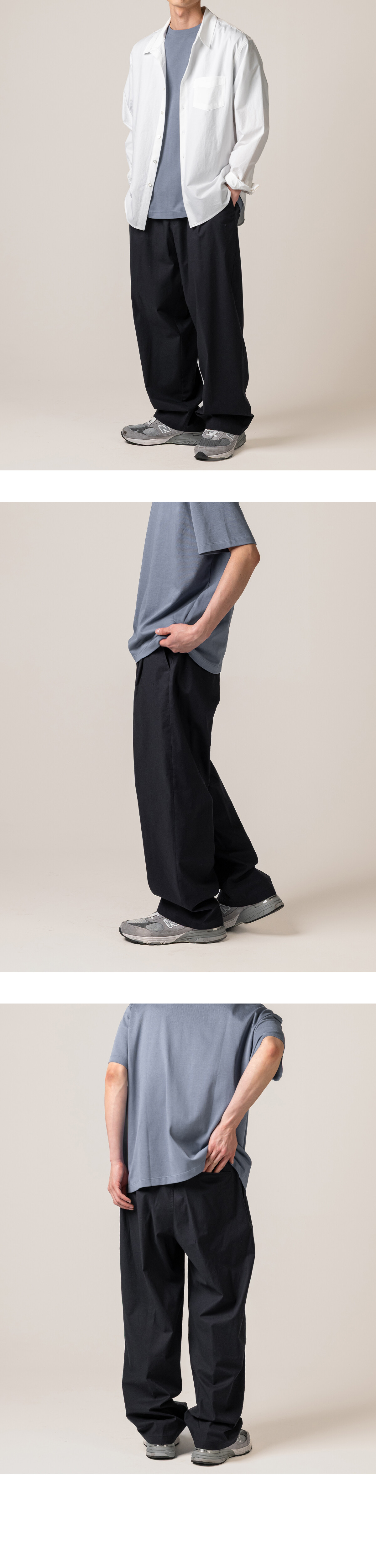 기본은 투 턱 구조를 그대로 가져갔습니다. 다만 주름의 깊이에 미세한 차이를 두어, 형태가 과하게 강조되지 않도록 조정했습니다. 이 디테일이 실루엣에 자연스러운 여유를 만듭니다. 의도적으로 부풀린 형태가 아니라, 입었을 때 편하게 형성되는 볼륨입니다. 실루엣은 와이드 스트레이트로 설정했습니다. 과하지 않은 선에서 정리해, 일상에서도 부담 없이 받아들여질 수 있도록 했습니다. 사용된 원단은 서니 드라이 포플린입니다. 기계적인 압력을 최소화하고, 햇볕 아래에서 천천히 건조해 완성됩니다. 포플린의 단정한 표면 위에, 서니 드라이 특유의 결이 더해지며 형태를 조금 부드럽게 만듭니다.