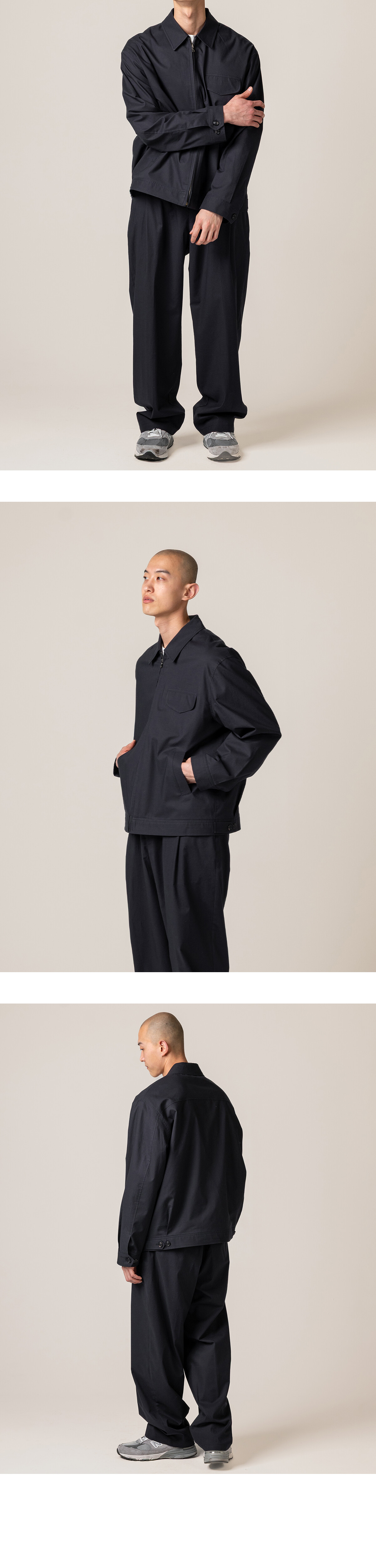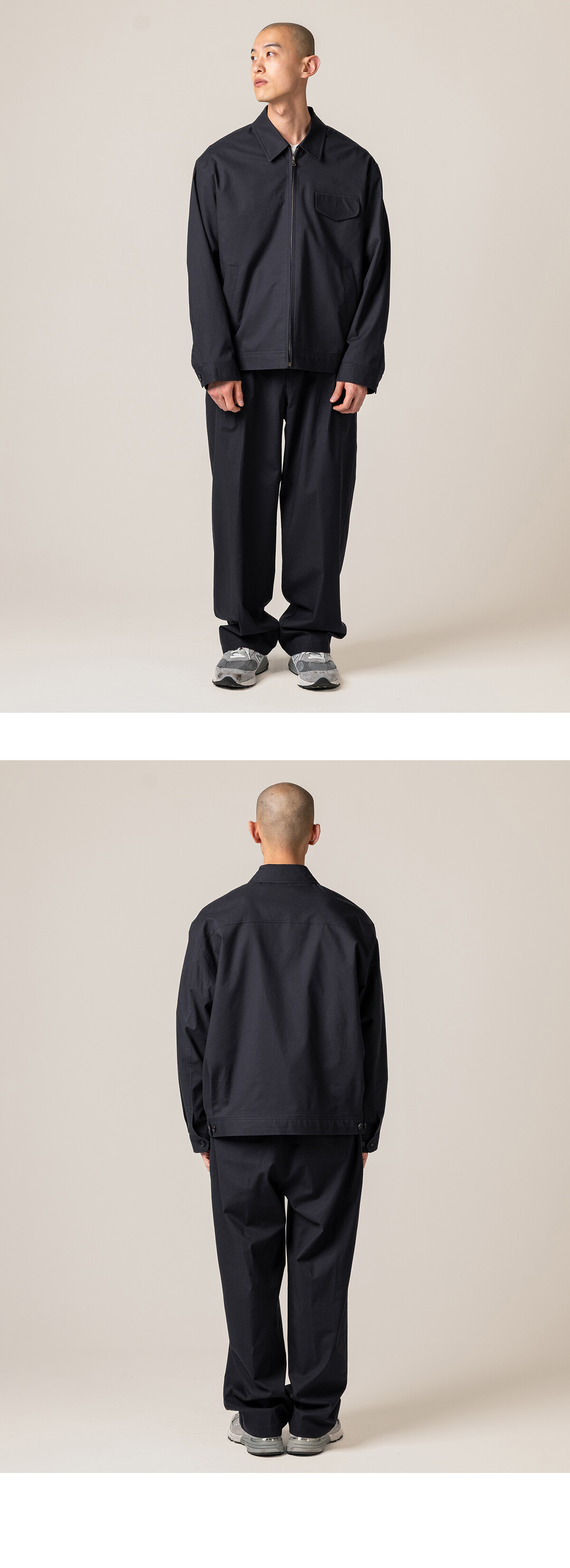 그 단정함을 과하지 않게 풀어줍니다. 단독으로도 충분하지만, 같은 원단의 팬츠와 함께 착용하면 보다 정리된 균형이 만들어집니다.