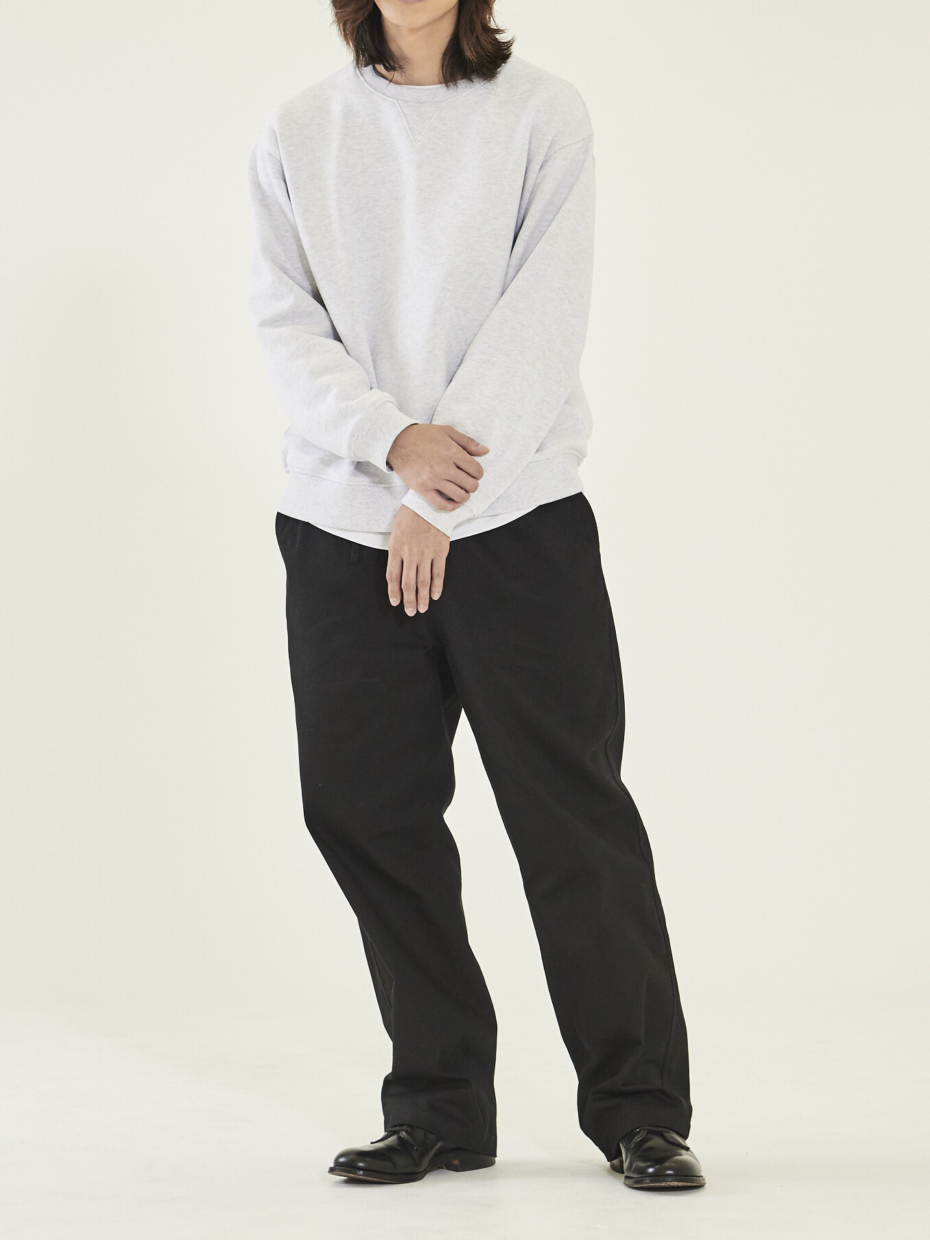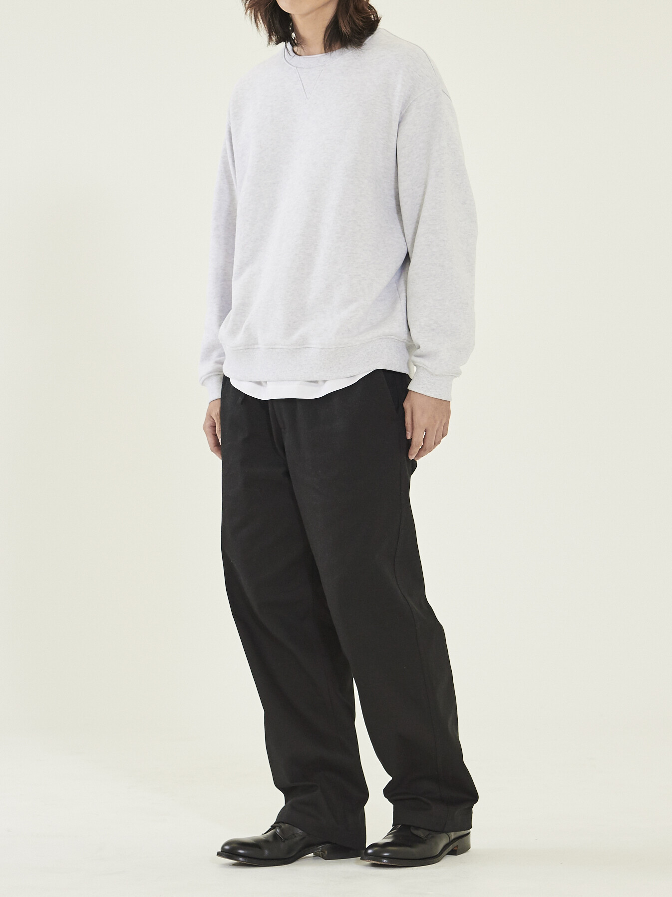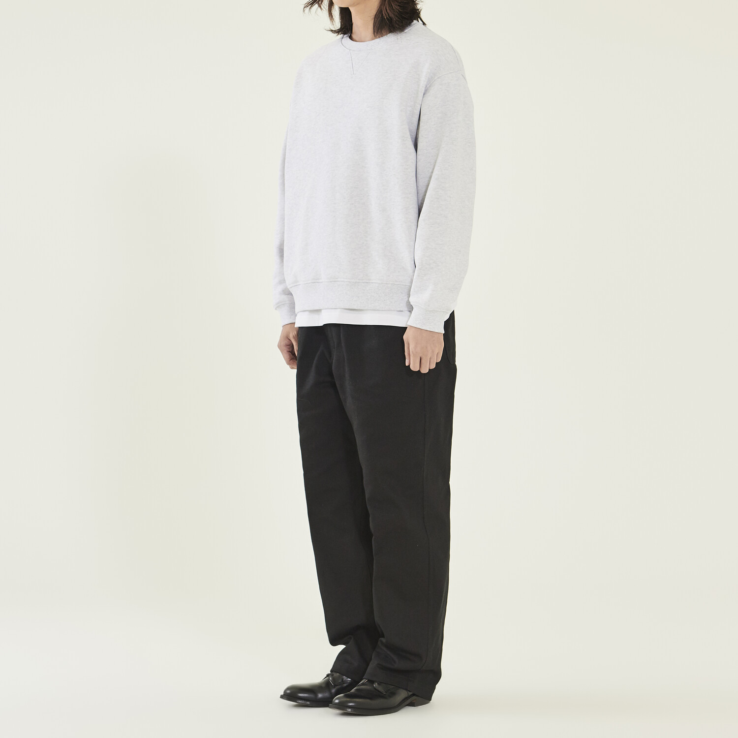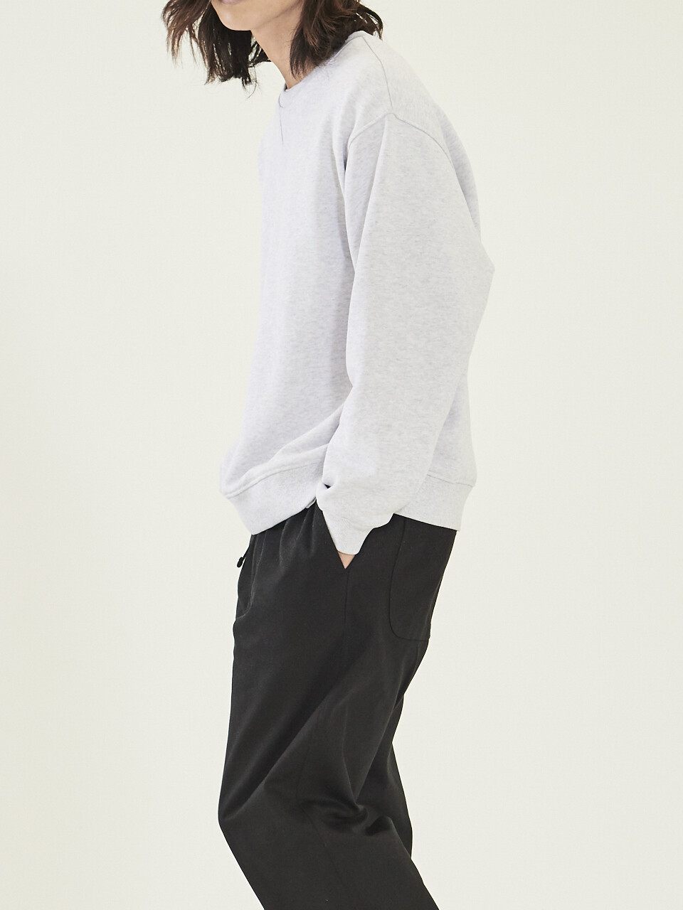 살짝 내려온 레글런 숄더 형태와 여유로운 품으로 편안한 실루엣을 연출했습니다. 4개의 실을 교차로 휘감는 봉제를 하고 제품의 완성 이후에는 후가공을 하는 등 세탁시 수축과 틀어짐을 최소화하고자 했습니다.