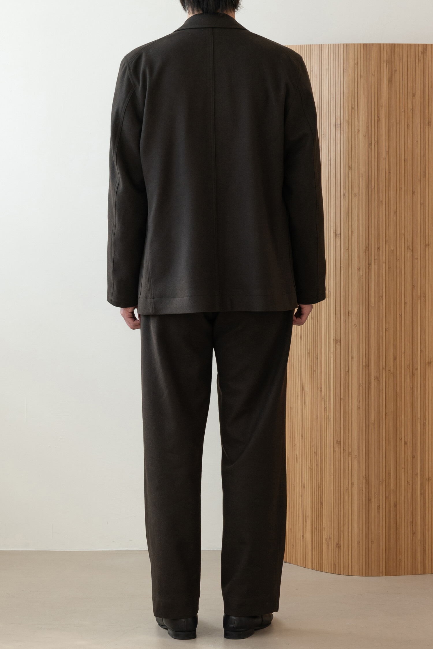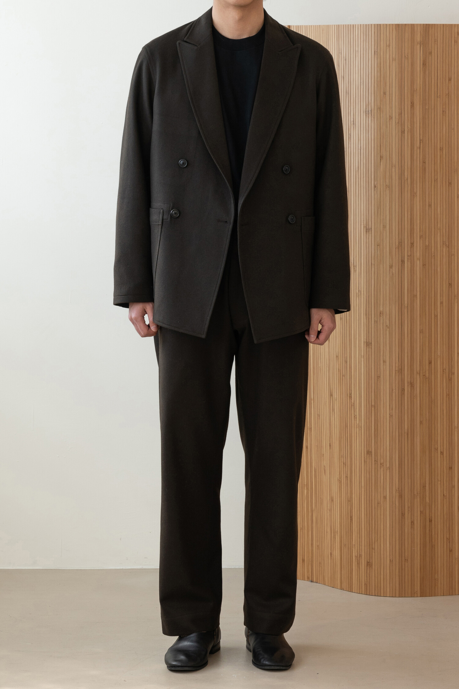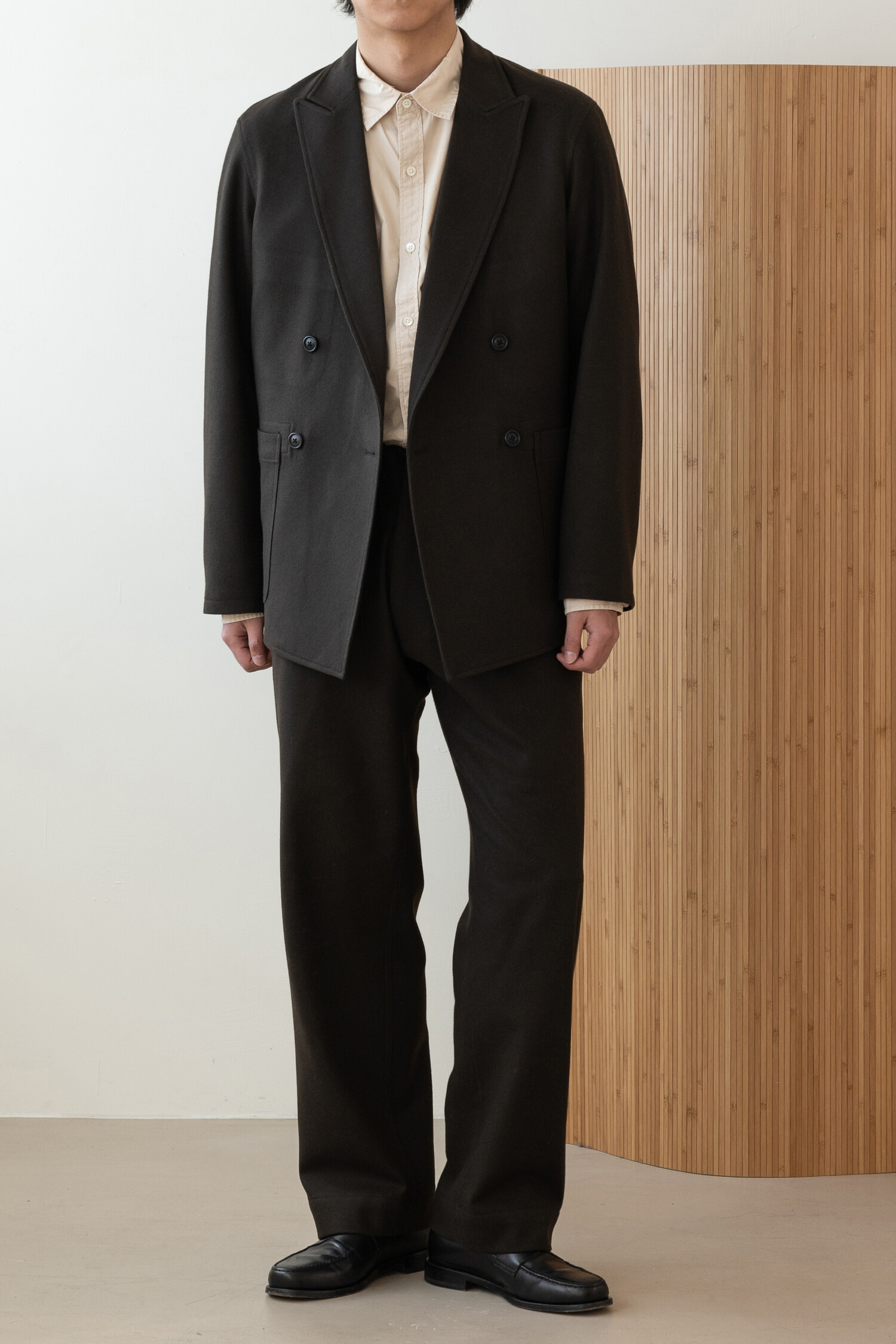 더블자켓의 형식을 유지하면서도 일상에 걸맞게 만들고 싶었습니다. 어깨선을 살짝 뒤로 넘겨 입체적인 실루엣을 완성했고, 너무 슬림하지도 오버하지도 않게 비율을 다듬었습니다. 이지 트라우저와 동일한 더블 페이스 원단을 사용했습니다. 원단 특유의 헤어리하고 자연스러운 질감이 더해져, 셋업으로도, 단품으로도 자연스럽게 어울립니다.