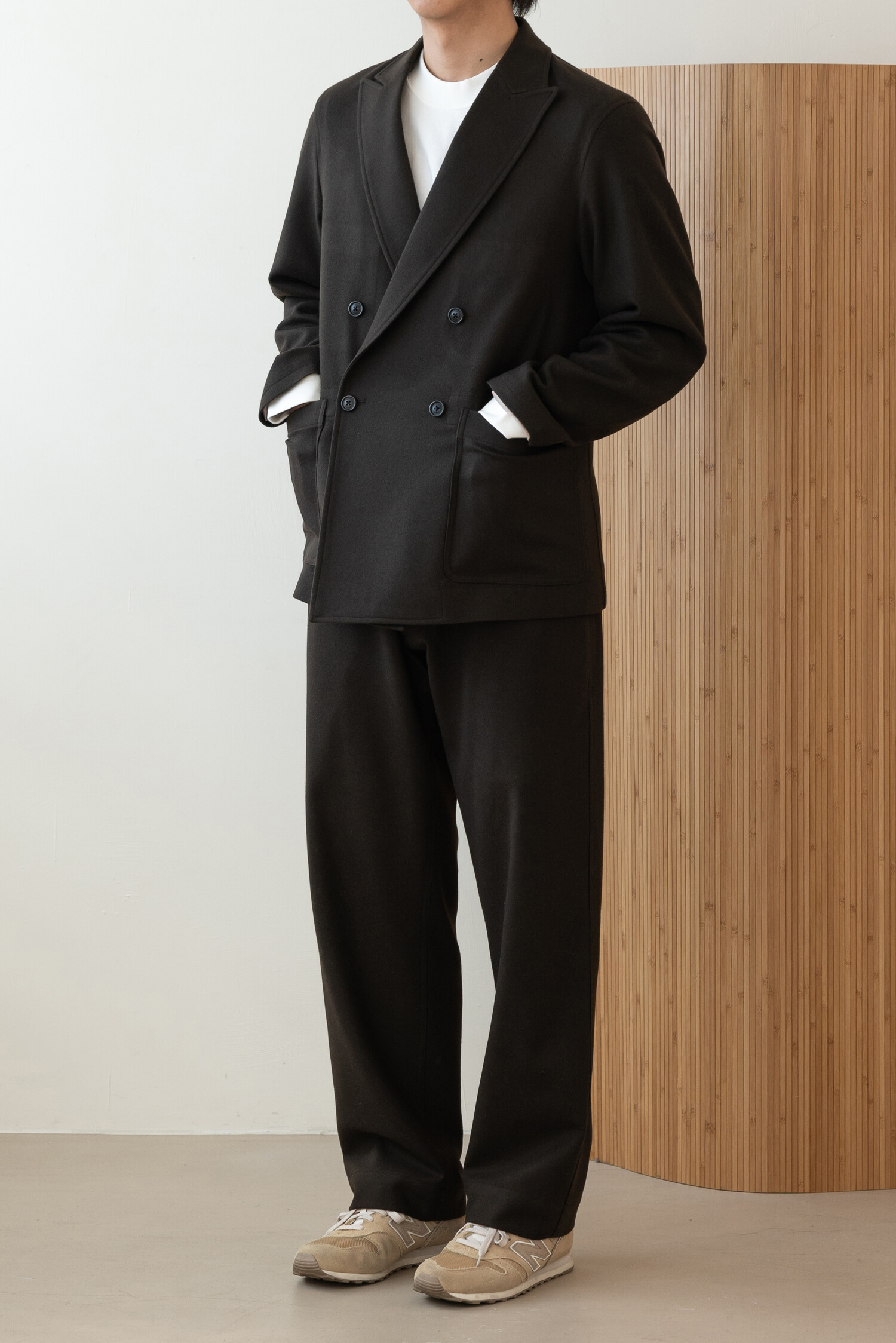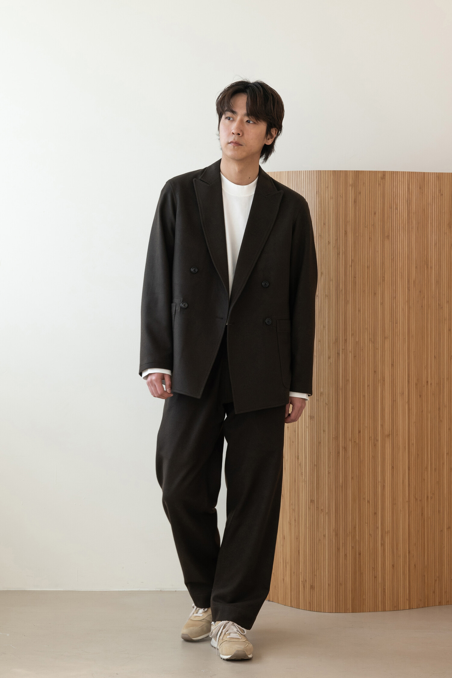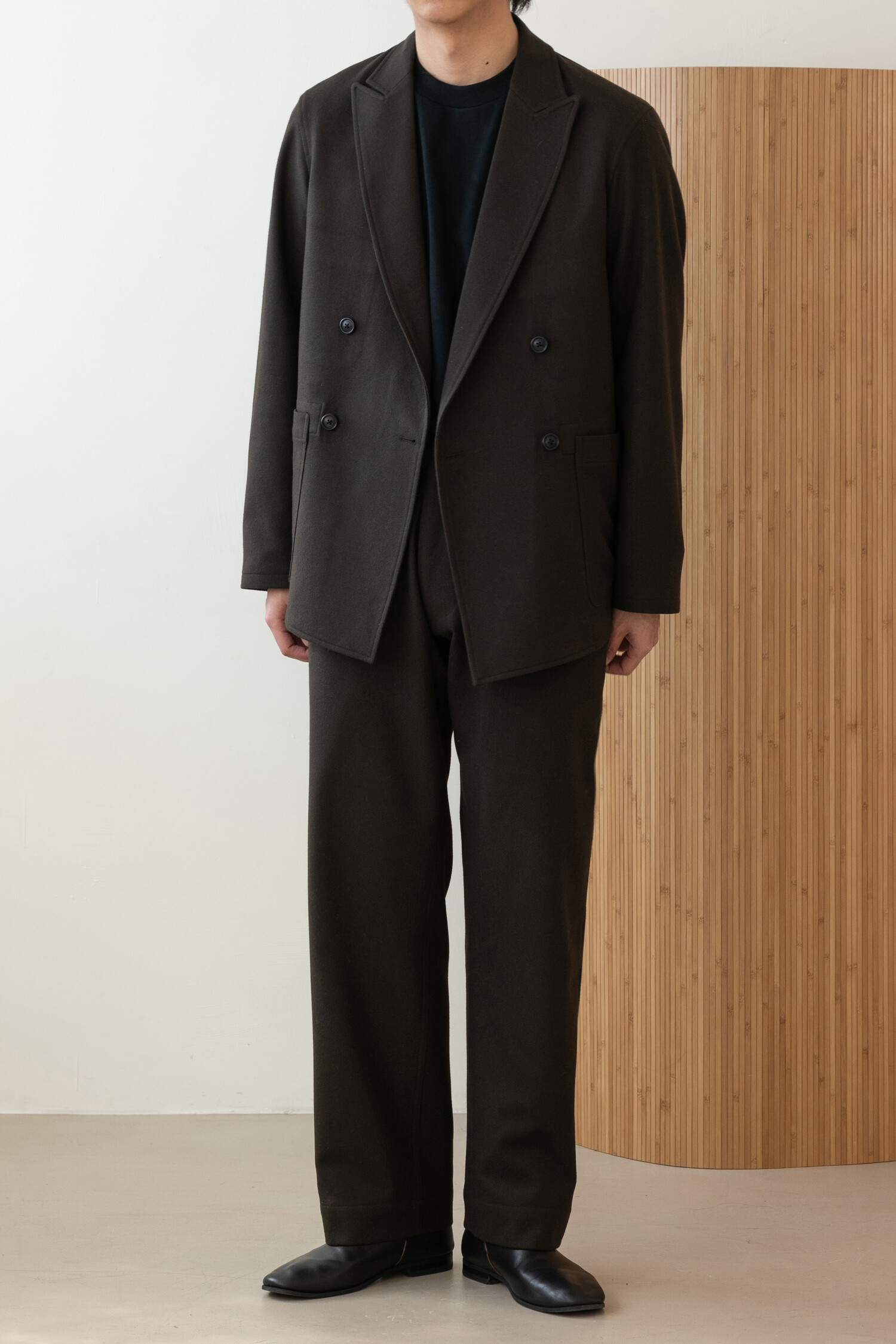 더블자켓의 형식을 유지하면서도 일상에 걸맞게 만들고 싶었습니다. 어깨선을 살짝 뒤로 넘겨 입체적인 실루엣을 완성했고, 너무 슬림하지도 오버하지도 않게 비율을 다듬었습니다. 이지 트라우저와 동일한 더블 페이스 원단을 사용했습니다. 원단 특유의 헤어리하고 자연스러운 질감이 더해져, 셋업으로도, 단품으로도 자연스럽게 어울립니다.